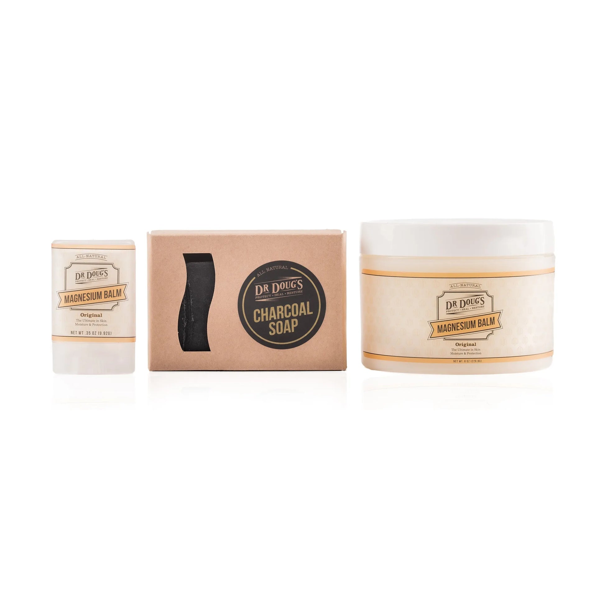 A bundle of all-natural, stress-relieving Magnesium Balms - a jar for at home and a convenient pocket size for on-the-go. Plus a Charcoal Soap to help make your day easier.