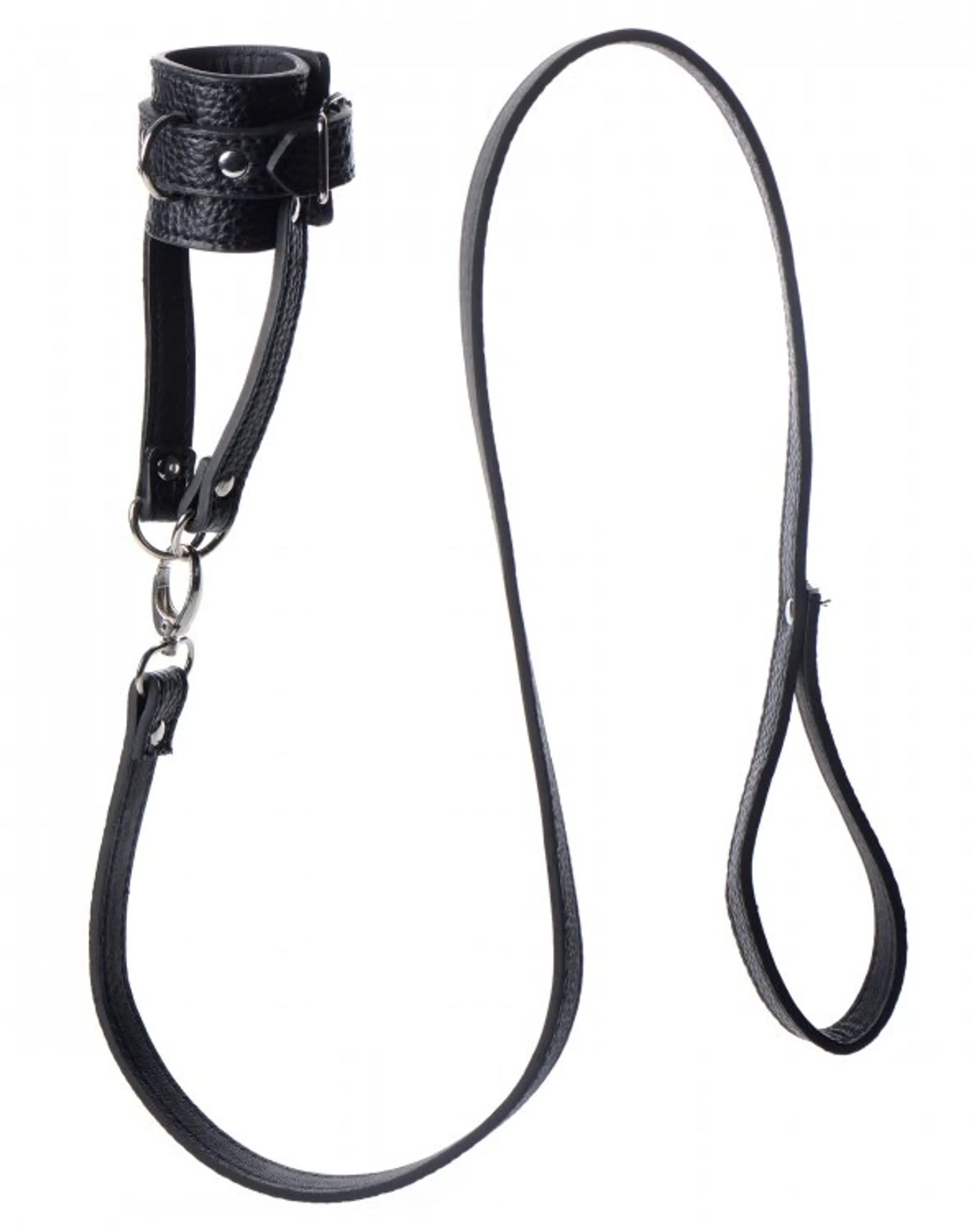 Strict Ball Stretcher with Leash from XR Brands. Take your pet for a walk with this humiliating ball stretcher and leash set! The adjustable stretcher will wrap around his scrotum and tug down, creating a unique sensation that will keep him on edge! Attach the leash to the D-ring on the front or on the straps at the bottom, to pull your plaything around by his balls! You can also use the D-rings to connect weights so that your slave is further tormented. Measurements: leash is 35.5 inches in length. Stretcher is 2 inches in width and adjusts up to 6 inches in circumference. Materials: Polyurethane PU Leather, Metal. Color Black. As seen in For Him FHM Magazine! Categories: Bondage, Fetish, Kink, Collars and Leashes, Men's Fetish Wear, Men's Cock and Ball Gear. 2023.