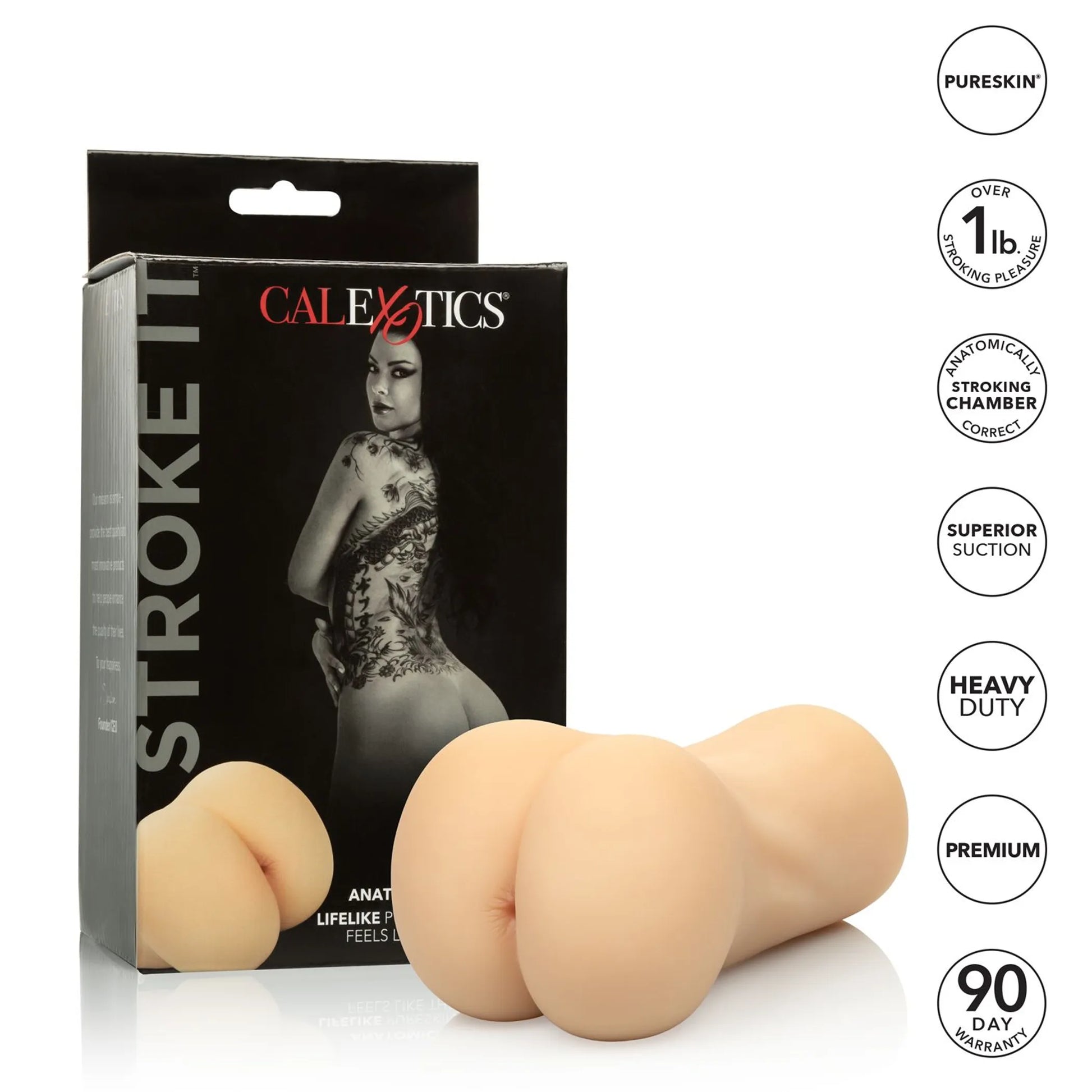 Stroke It Ass Ivory Light Skin Tone Beige Masturbator from California Exotic Noveltes. The Stroke It collection brings you the Ass stroking sleeve, made to thrill with every ultra-tight stroke; Dive deep into over 1 pound of heavy-duty stroking pleasure with erotically plump cheeks and an ultra-tight, closed ended chamber. Our plump stroker sleeve is great for anyone wanting a little extra oomph in their solo play; Over 1 pound of Pure Skin material make for the truly heavy duty, pounding pleasure you have been craving. The indulgent Stroker has a textured, anatomically correct chamber for explosive stimulation. Use this close ended Sleeve with ample lubrication for powerful suction worthy of your naughtiest fantasies. Pure Skin Thermoplastic Rubber TPR is a super soft, ultra stretchy material with a unique, life like feel delivering pure satisfaction in every stroke. This durable Sleeve is easy to use, easy to clean and requires no special care. Prior to and after each use, wash sleeve internally and externally with warm water and soap, then disinfect with the Universal Toy Cleaner. Color Ivory, Light Skin Tone, Beige. Materials: Thermoplastic Rubber TPR. Features: Phthalate free. Allergens N/A. Measurements 6.5 inches by 3.75 inches Masturbator. Bulk weight 20.4 ounces. Package 22.6 ounces. Package 3 inches by 4.5 inches by 8.5 inches. Categories: Male Masturbators, Sex Toys for Men, Solo Masturbators, Ass Strokers, Masturbation Sleeves. 2023.