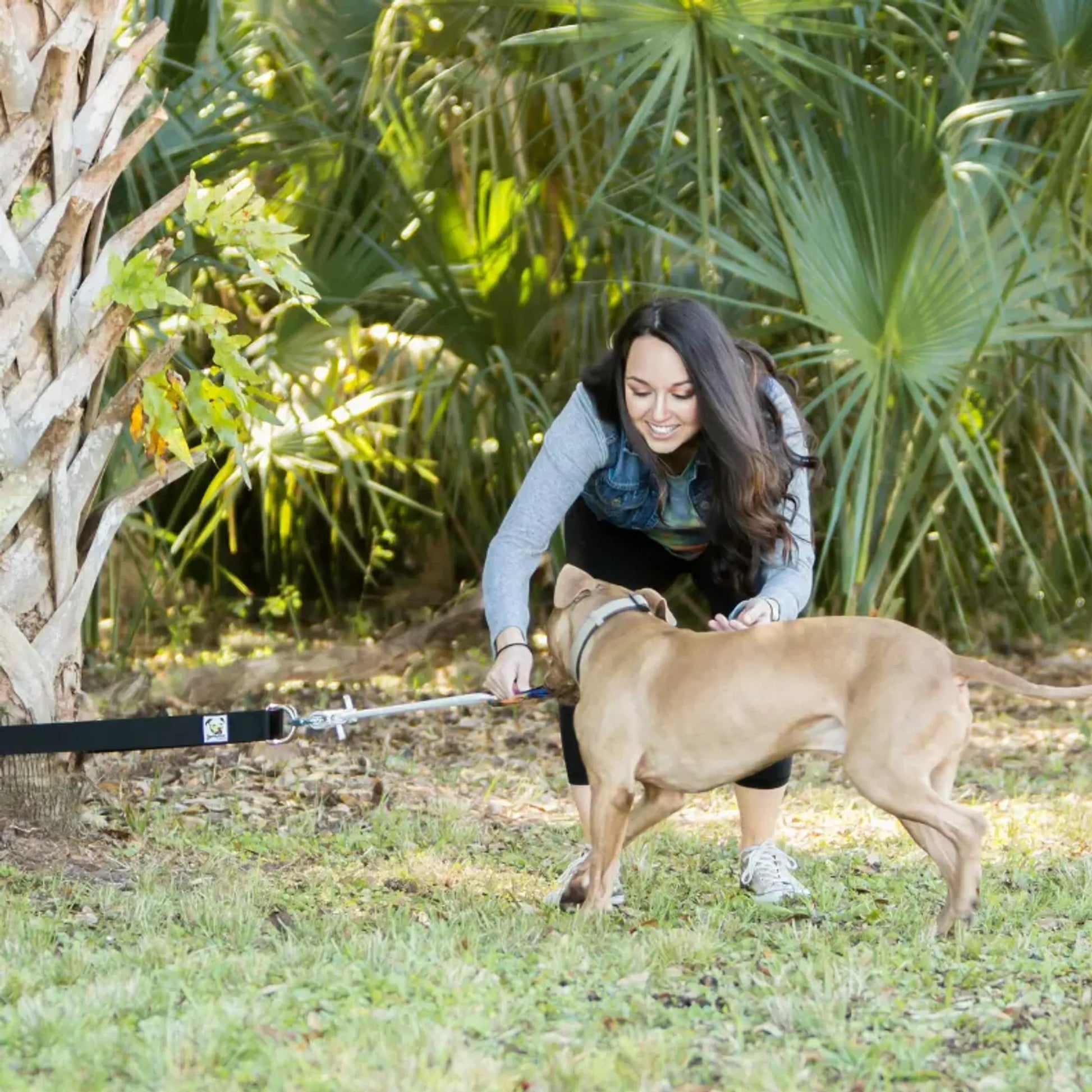 It uses a horizontal configuration instead of the vertical one used in traditional spring pole designs. It also uses super strong, marine grade bungee cord instead of a metal spring. The connection points are designed so that in case of failure, nothing comes flying back towards your dog.