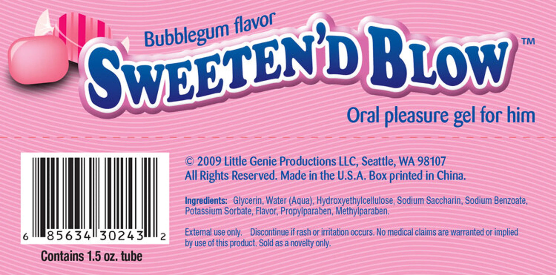 Sweeten'd Blow Bubble Gum Flavor Oral Pleasure For Him. Specially Formulated for Him! Make your next oral encounter sweeter with Sweeten'd Blow. Simply rub some of the flavored gel on your lover's private areas or any area that you wish to sweeten and then lick it off. Perfect for couples! It works great on him or her. Oral sex has never been more pleasurable.Oral Sex has never been more pleasurable! Make your next oral encounter sweeter with Sweeten'd Blow. 1.5 ounces tube. Ingredients: Glycerin, Water, Hydroxyethylcellulose, Sodium Saccharin, Sodium Benzoate, Potassium Sorbate, Flavor, Propylparaben, Methylparaben. External use only. Discontinue if rash or irritation occurs. No medical claims are warranted or implied by use of this product. Sold as a novelty only. Sweeten'd Blow Bubble Gum Flavor Oral Pleasure For Him from Little Genie. Made in the USA. Categories: Erotic Body Lotions, Gels, Flavored Lubricants, Oral Products. 2023.