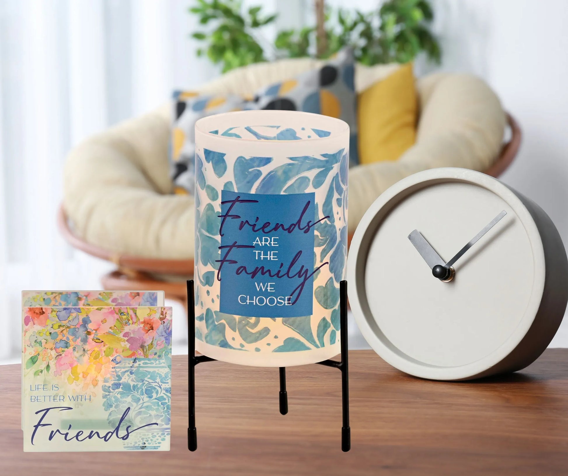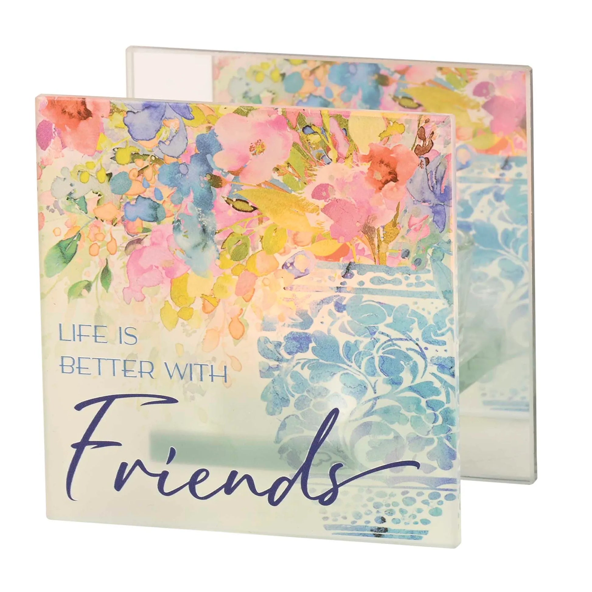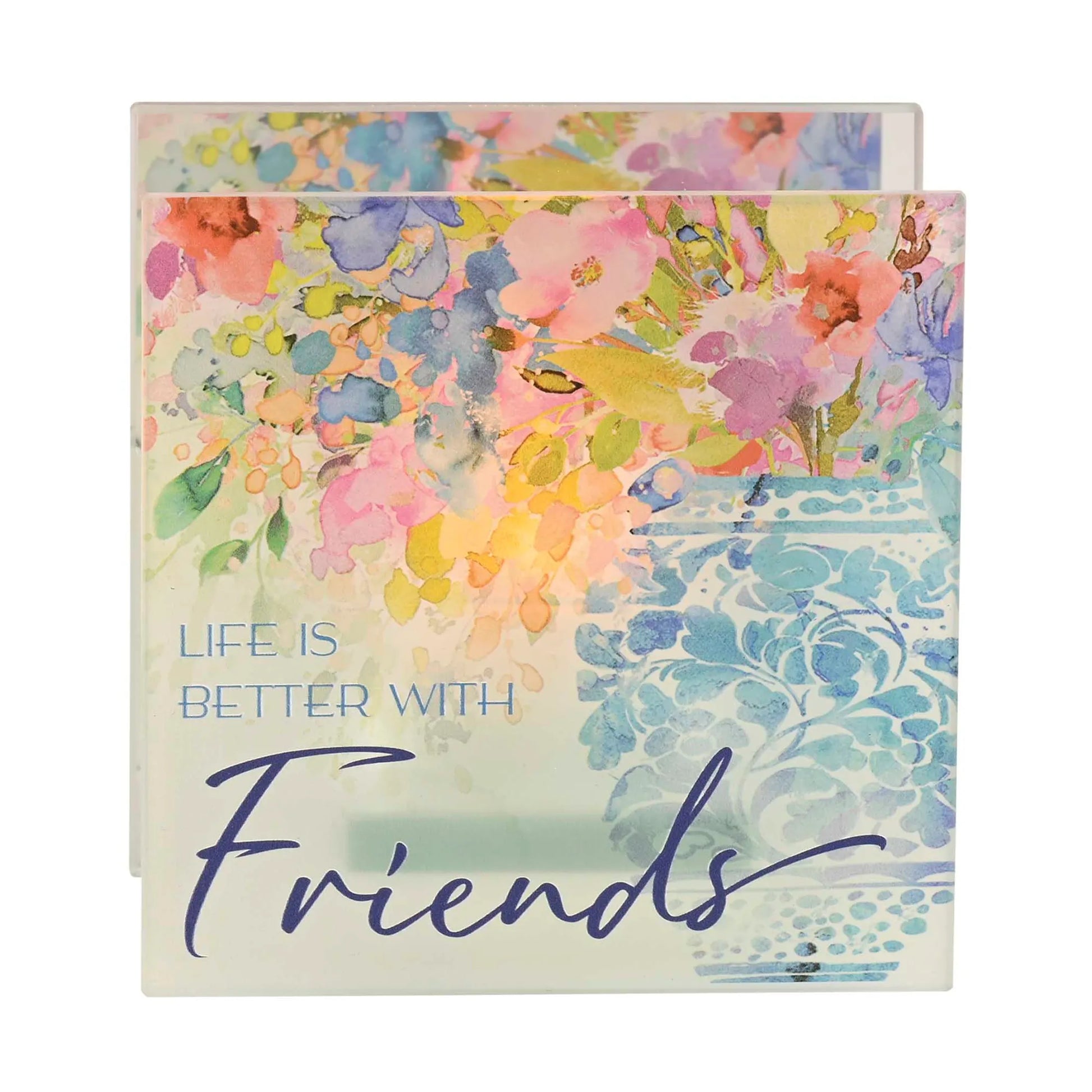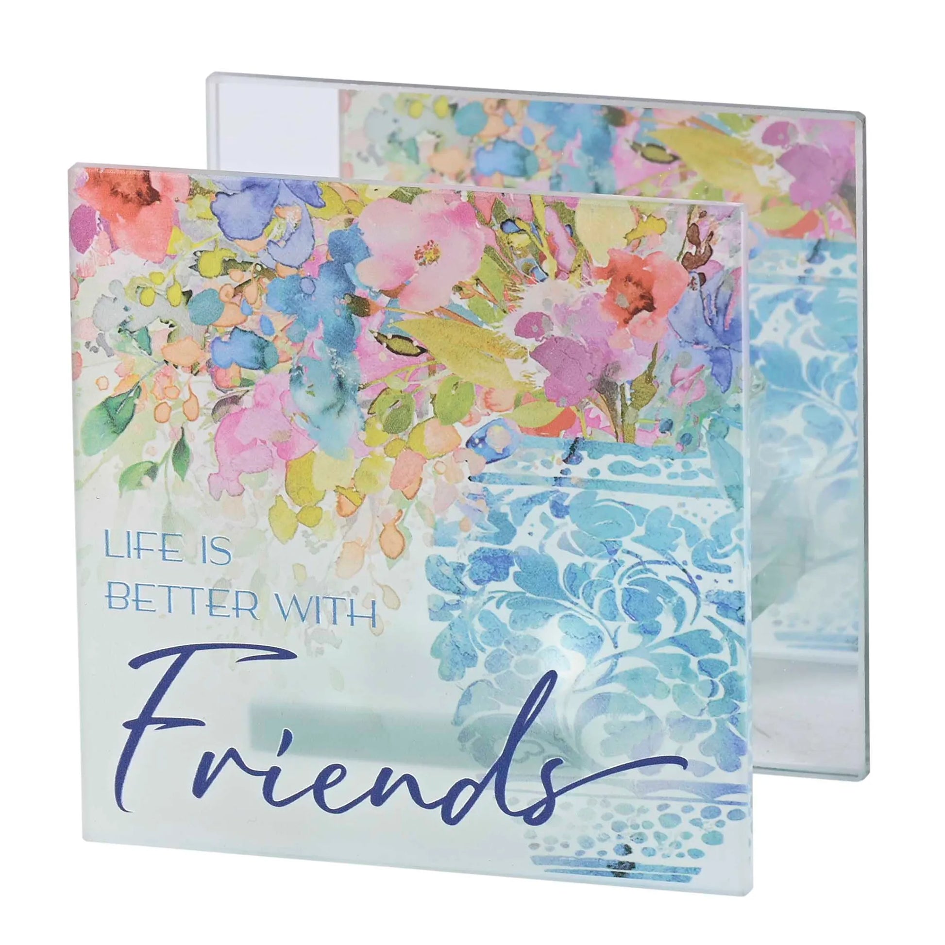 Unique Tealight Holder Glows With Beauty And Inspiration. Glass Squares Are Frosted Outside, Mirrored Inside To Enhance The Soft Light Shining From The Included Led Tealight On Center Shelf. Front Glass Square Is Decorated With Beautiful Floral Artwork - Copyright Amylee Weeks Courtesy Of MHS Licensing. Size Is 4 Wide X 4 High X 2.4 Deep. Sentiment: Life Is Better With Friends. Comes Packed In A Brown Box.