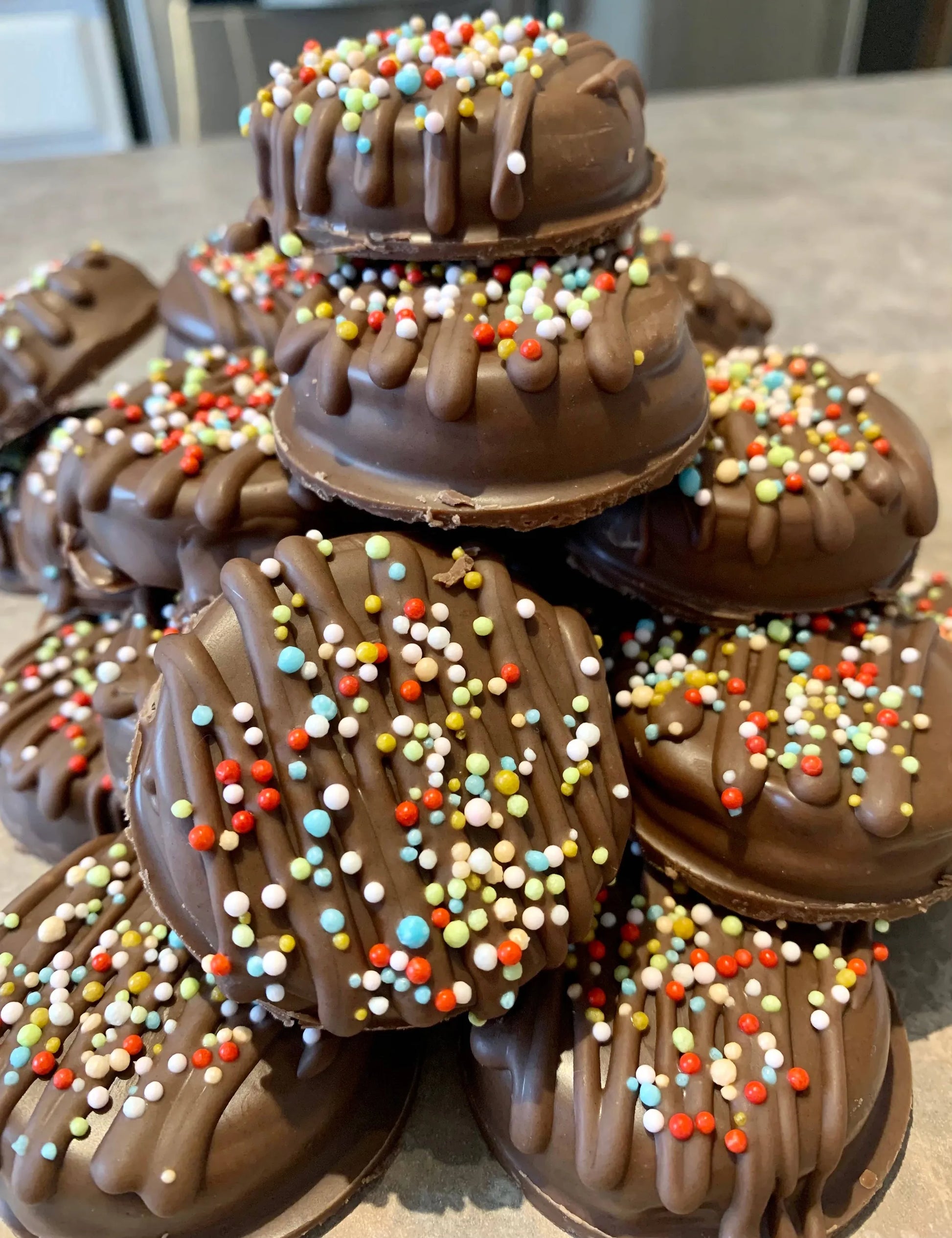 Carob Oreo with vanilla stuffing, dipped in dark carob icing, swirled on top with dark carob icing and dusted with sprinkles.