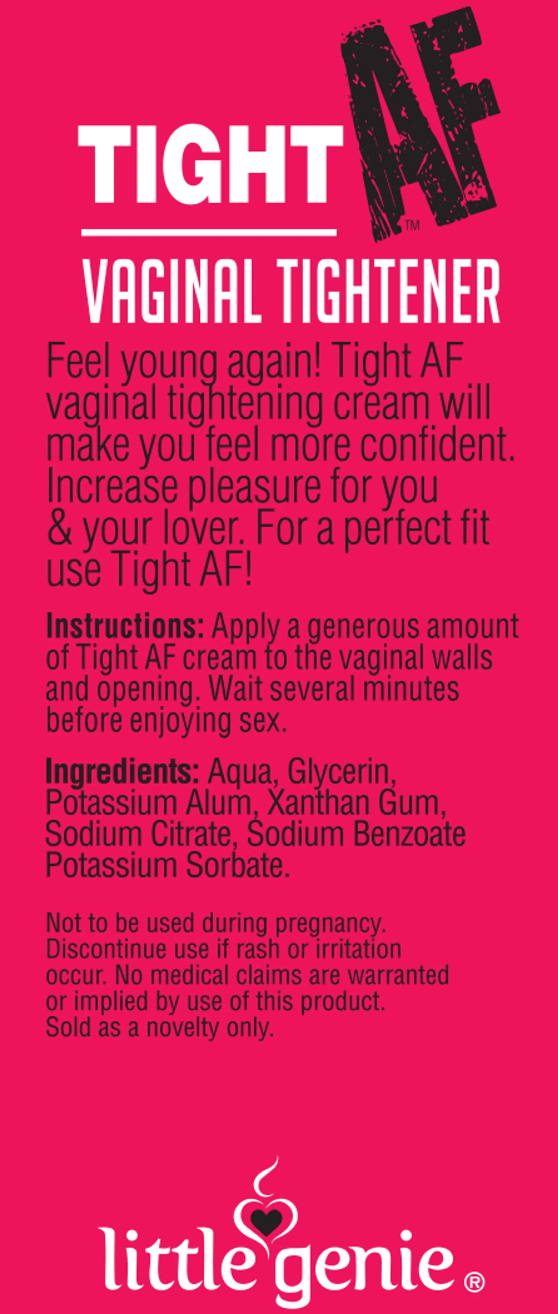 Tight AF Tightening Cream from Little Genie. Increase your sexual pleasure. Vaginal tightener for her. Tube contains 1.5 ounces. Enhance your sexual experience with Tight AF vaginal tightener. This specially formulated product will increase sensitivity and enjoyment for an amazing sexual experience. Surprise him tonight Tight AF and he will happy AF! Instructions: apply a generous amount to vaginal walls and opening. Wait several minutes before enjoying sex. Ingredients: water, glycerin, Potassium Alum, Xanthan Gum, Potassium Citrate, Sodium Benzoate, Potassium Sorbate. Warnings: not to be used when pregnant. Discontinue use if rash or irritation occurs. No medical claims are warranted or implied by this product. Sold as a novelty only. Categories: Erotic Body Lotions, Creams, Health and Beauty Aids, Sex Toys for Women. 2022