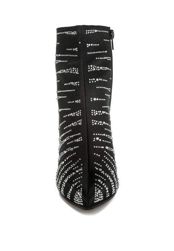 Refresh your wardrobe with these satin ankle boots, complete with a pointed toe, sleek stiletto heel, and dazzling rhinestones. Ideal for parties, weddings, or date nights, these boots add the perfect amount of sparkle and elegance to any special outfit.