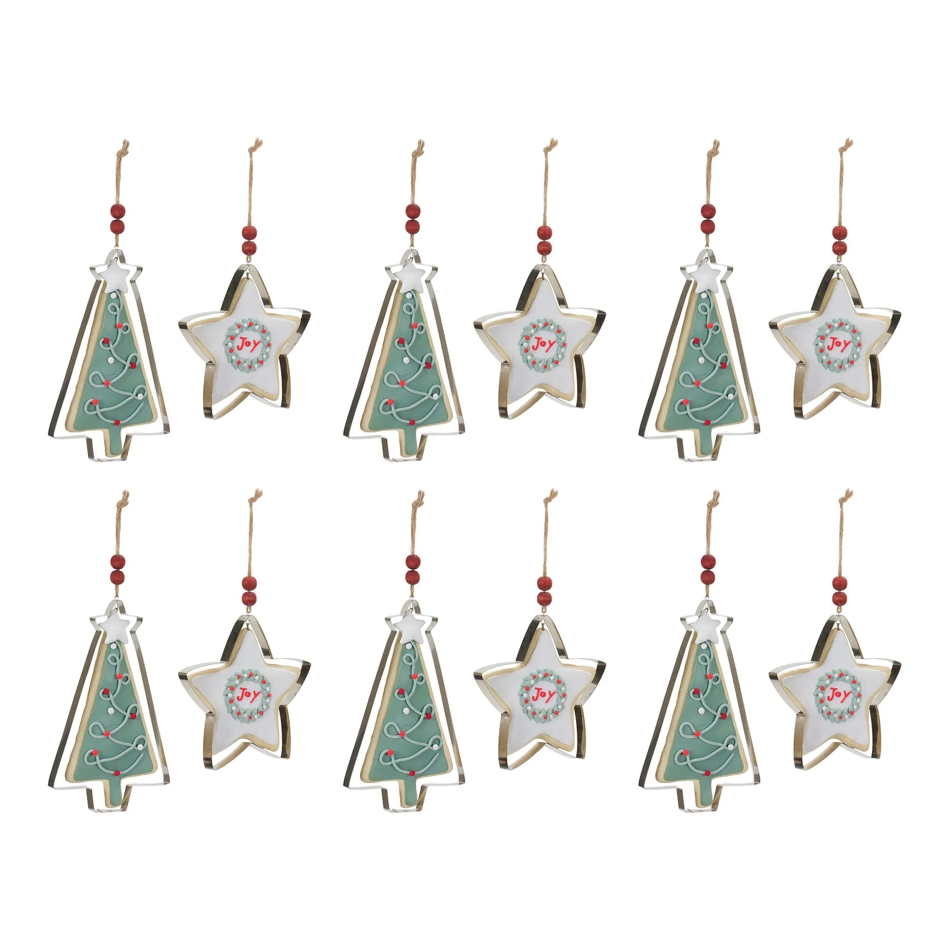 Add a traditional touch to your Christmas Tree with this beautiful set of Star and Tree Cookie Cutter Ornaments. Featuring 12 pieces, this set's festive red and green tones, frosted cookie designs, and wood bead accents are the perfect combination to create a memorable display. The quality metal and clay dough composition with jute string hanger is sure to endure for seasons to come. Whether you're adding a touch of cheer to your home or gifting to a loved one, these ornaments will definitely bring smiles to your home.