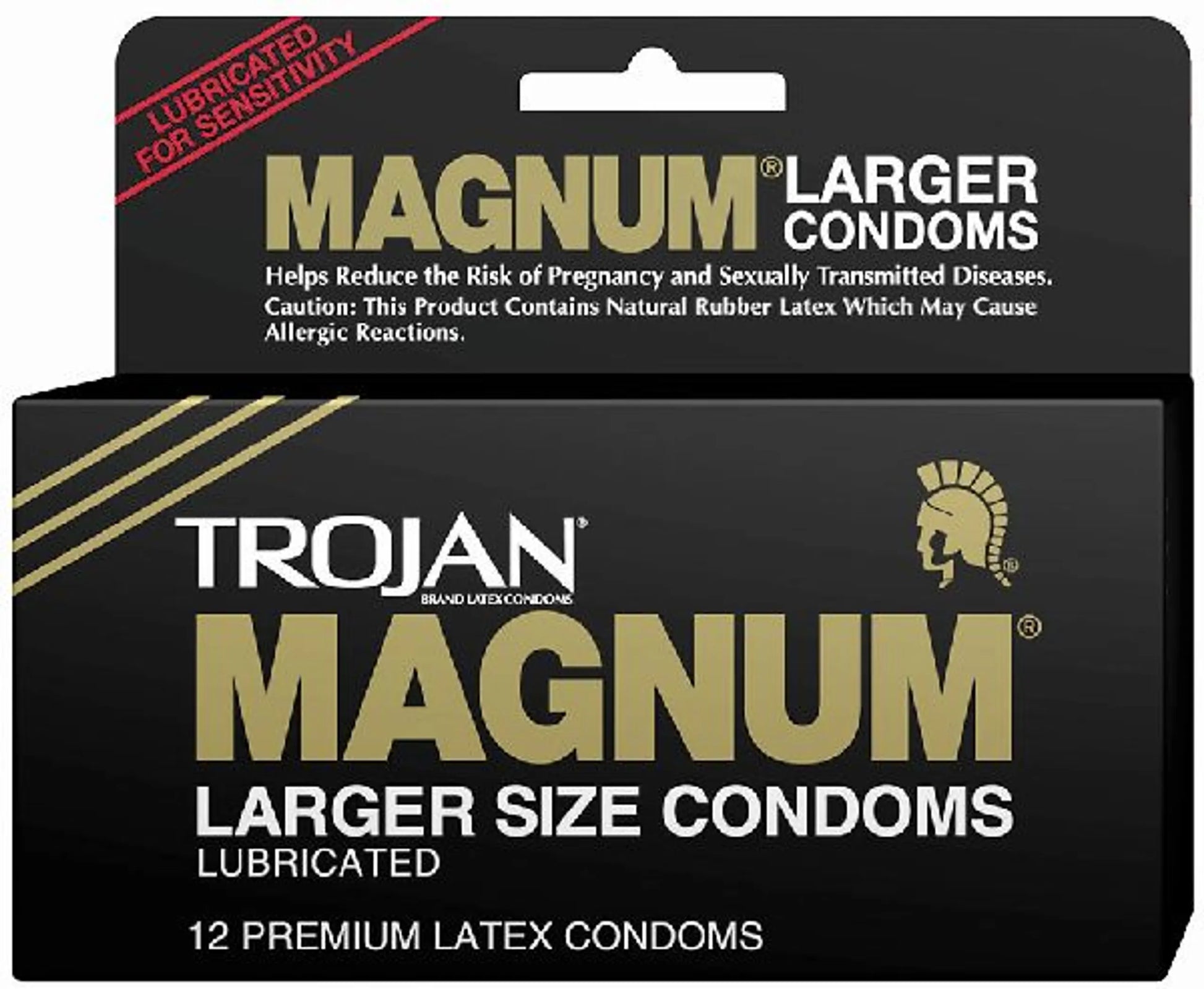 Trojan Magnum Condoms 12 Pack. The Trojan Magnum is larger than standard latex condoms for extra comfort. Tapered at the base for a secure fit. Silky smooth lubricant for comfort and sensitivity. Made out of Premium quality latex. Reservoir end. Trojan Magnum is made from premium quality latex helps reduce the risk of sexually transmitted diseases and unwanted pregnancies. Lubricated condoms for comfort and sensitivity. Special reservoir end for extra safety. 15% larger than standard size for extra comfort. Tapered at the base for a secure fit. Each measures 8.07 inches long by 2.17 inches wide with a thickness of .003 inches. A condom is a barrier device most commonly used during sexual intercourse to reduce the probability of pregnancy and spreading sexually transmitted diseases, STDs such as gonorrhea, syphilis, and HIV. It is put on a man's erect penis and physically blocks ejaculated semen from entering the body of a sexual partner. Because condoms are waterproof, elastic, and durable, they are also used in a variety of secondary applications. These include collection of semen for use in infertility treatment as well as non-sexual uses such as creating waterproof microphones and protecting rifle barrels from clogging. Safe sex practice, birth control, disease prevention, pregnancy prevent. Always practice safe sex. Trojan Brand Magnum Large Latex Condoms from Paradise Marketing.