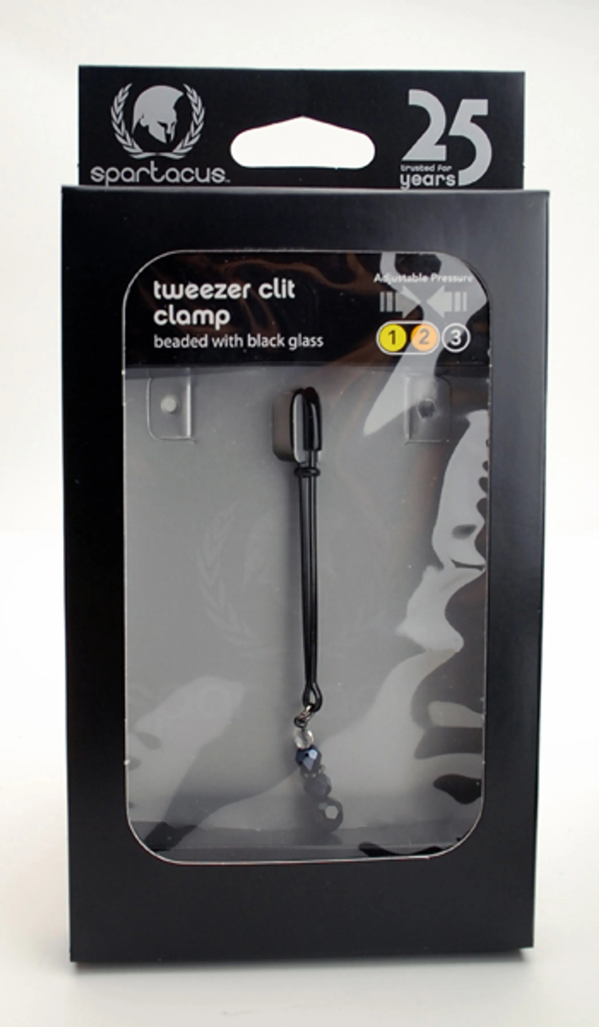 A unique accessory for your BDSM sessions, this elegantly decorated clit clamp features sparkling faux crystals on a tweezer style clamp. Simply place the rubber-tipped ends on either side of her clit and slide the adjustment ring to the desired tightness for maximum effect. The gentle weight of the plastic crystals will sway with each movement, offering her pleasure. The decorations also make a devilish target for tapping, tugging, and other stimulation that will keep her on the edge! Color: Silver, Black Type: Clit Clamp. Material: Metal, Rubber, Plastic. Style: Tweezer. Length: 4 inches. Special Features: Faux Gem Accent, Adjustable. Spartacus A Passion for Quality Catalog page 9.