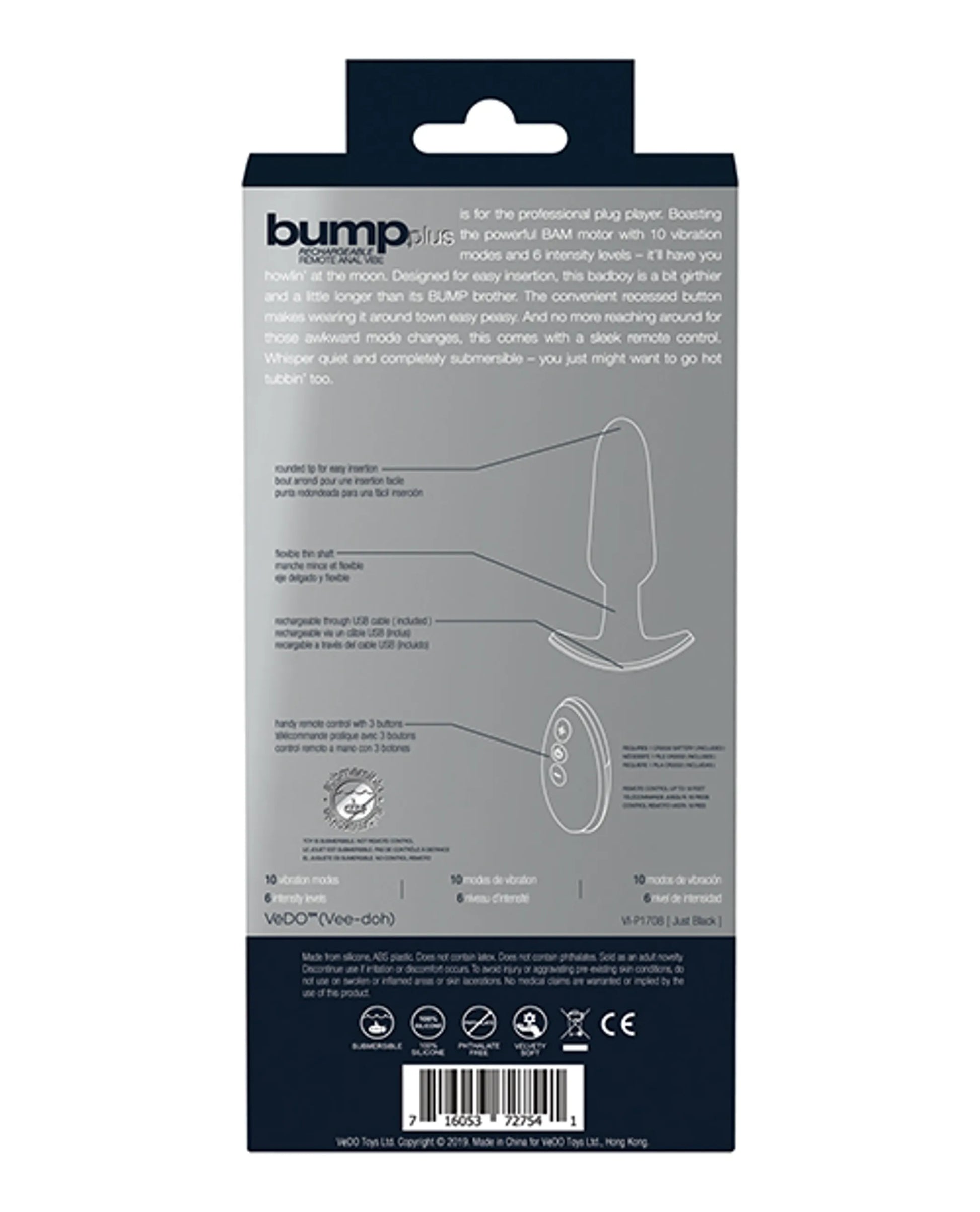 Vedo Bump Plus Rechargeable Remote Control Anal Vibe Just Black. Feature 10 vibration modes. 6 intensity level. Bump Plus Rechargeable anal plug slides into action with an extremely powerful motor. Boasting 10 super charged vibration modes, this anal plug takes no prisoners. Specifically designed for easy insertion with just enough girth and a long thin shaft to make rocking on this bad boy, oh so pleasurable. Remote control features 3 push button operation. Made using body safe materials Silicone. Bump rechargeable anal plug slides into action with an extremely powerful motor. Boasting 10 supercharged vibration modes, this anal plug takes no prisoners. Specifically designed for easy insertion with just enough girth and a long thin shaft to make rocking on this bad boy, oh so pleasurable. And do not be afraid to get wet and wild because it?EUR(TM)s completely water submersible. Everybody can use a little bump in their bum. Product features: extremely powerful motor. Rechargeable via a USB port, USB cable included. 10 vibration modes. One button easy control. Extremely quiet operation. Velvety smooth Silicone. Designed for an easy insertion. Designed for wearable everywhere. Submersible. Running, play time 1 hours. Product measurements length 12.7cm, maximum diameter 3cm e or approximately 5 inches in length by 1.18 inches in width. Categories: Anal Toys, Prostate Massagers, P-Spot Stimulators, Small, Medium Butt Plugs, Vibrators, Rechargeable Vibrators, T Plugs. Restricted, Amazon Restricted. 2022. _x000D_
