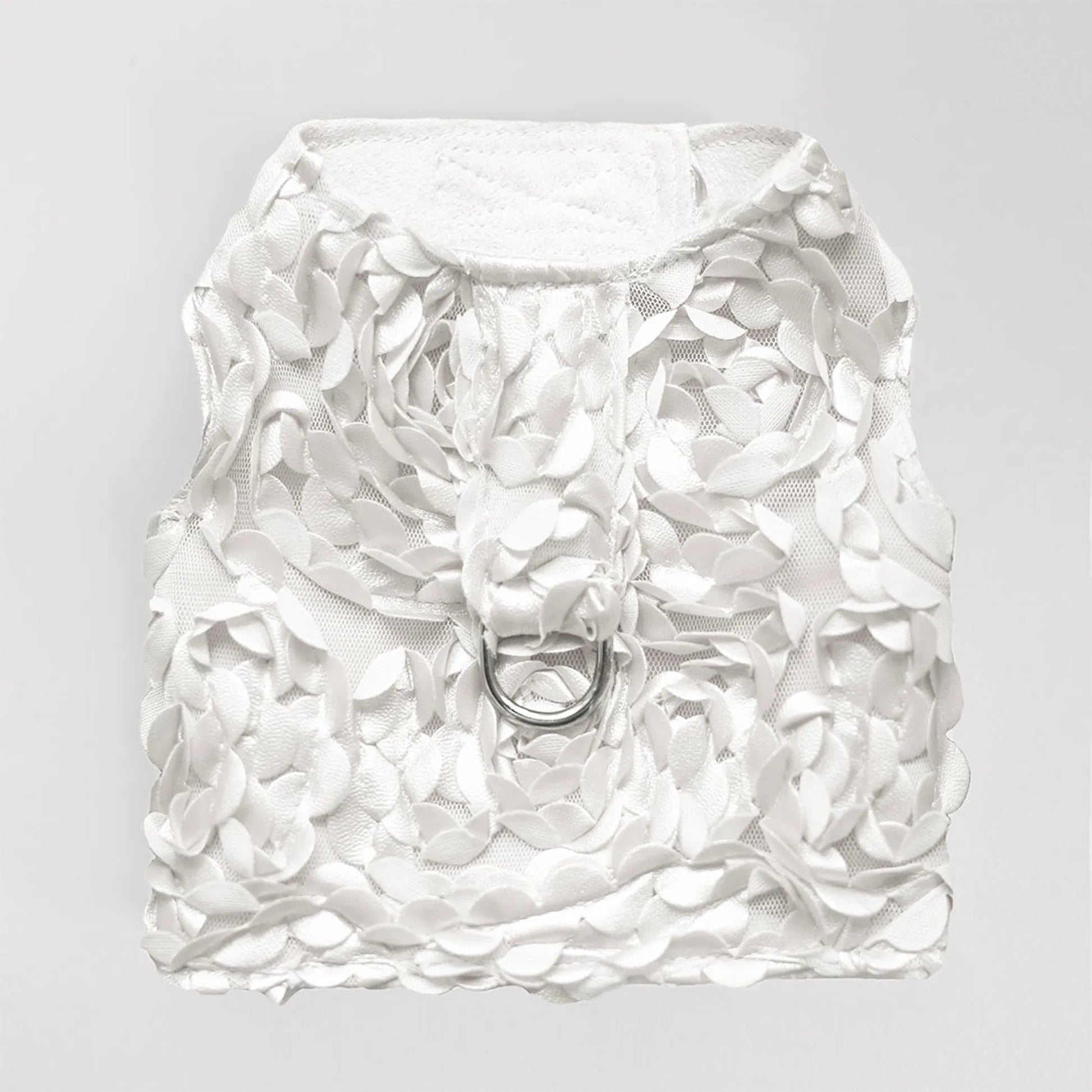 This Victorian Harness by Hello Doggie features frilly rose fabric, luxurious micro suede lining, adjustable Velcro straps and a d-ring to attach to a safety tether. Your pup will the center of attention on their walk through the city. This harness is easy to care for, spot clean with cold water. No bleach or softener, air dry. Matching harness available, sold separately Available in white, black, and peach._x000D_ _x000D_ _x000D_ _x000D_ Sizes: XS LG_x000D_ _x000D_ MSRP: $84.00_x000D_ _x000D_ *Harnesses are handmade, sizes may vary slightly. Made in USA.