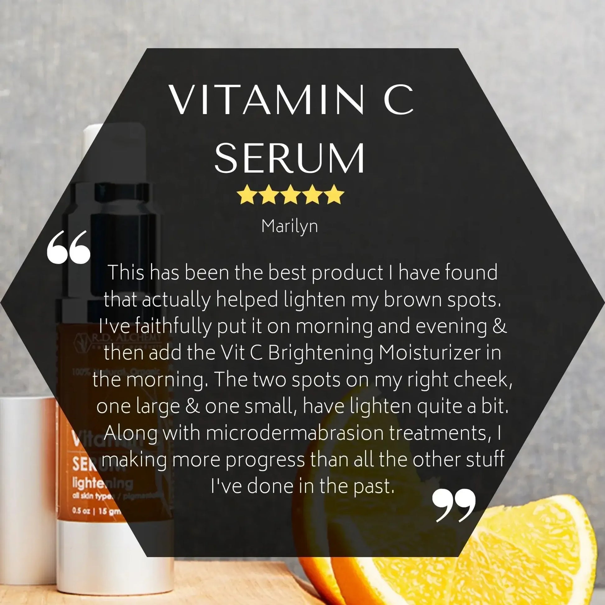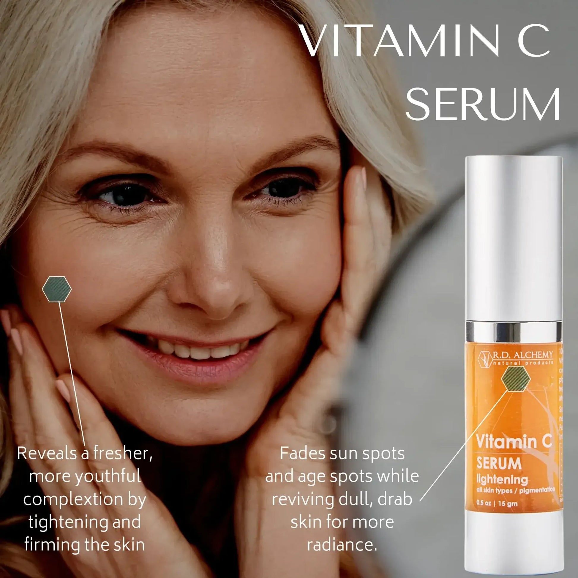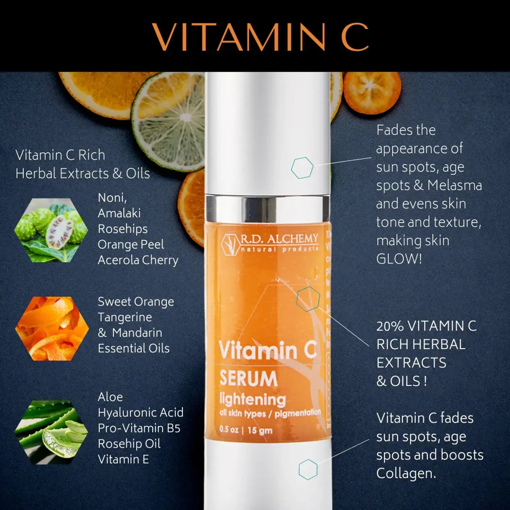 Want a renewed glow with a more uniform appearance? If dull, drab skin spotted with pesky dark spots isn't your ideal look, then wait no longer for clearer, more even and luminous skin. Our professional strength Vitamin C Serum is for serious pigment offenders that need brightening and lightening of dark spots and a renewed, fresh glow. Vitamin C rich herbal extracts combined with Hyaluronic Acid, exfoliate, and increase cellular turnover to dissolve away excess pigment and dead skin cells for your best skin yet. Perfect for all skin types that want to fade pigmentation, brighten and lighten skin tone and texture that aren't sensitive to Vitamin C.This serum improves overall skin tone and texture and most importantly helps fade age spots, Melasma and sun spots creating a brighter, glowing skin tone! Vitamin C helps improve the appearance of scars or damaged tissue and is naturally tightening and exfoliating to help reveal a fresher, firmer complexion.