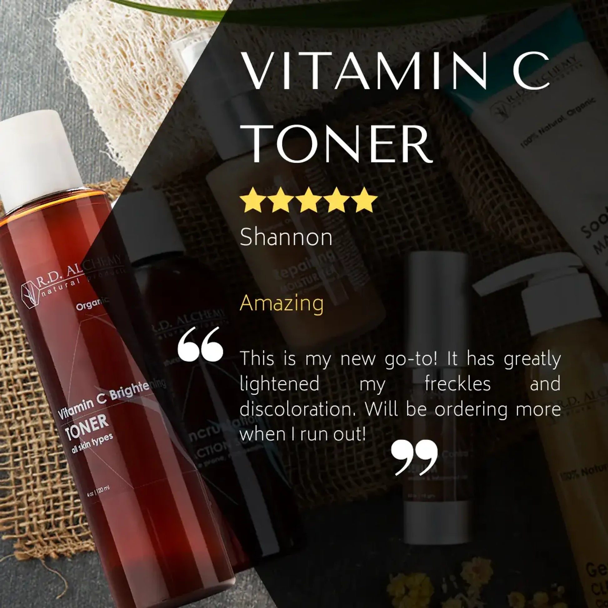 Refresh, tone and brighten your skin naturally with this Vitamin C toner loaded with Vitamin C enriched herbal extracts of Noni, Amalaki, Rosehips, Orange and Acerola Cherry. Antioxidants brighten skin tone and boost collagen production as astringent herbal extracts tighten and tone to reduce the appearance of large pores and prep your skin before applying serums, moisturizers or foundations. pH balanced for maximum efficiency. A perfect addition to your routine; this toner leaves your skin more vibrant with less pigmentation, smooth, tonified and smelling like fresh oranges.