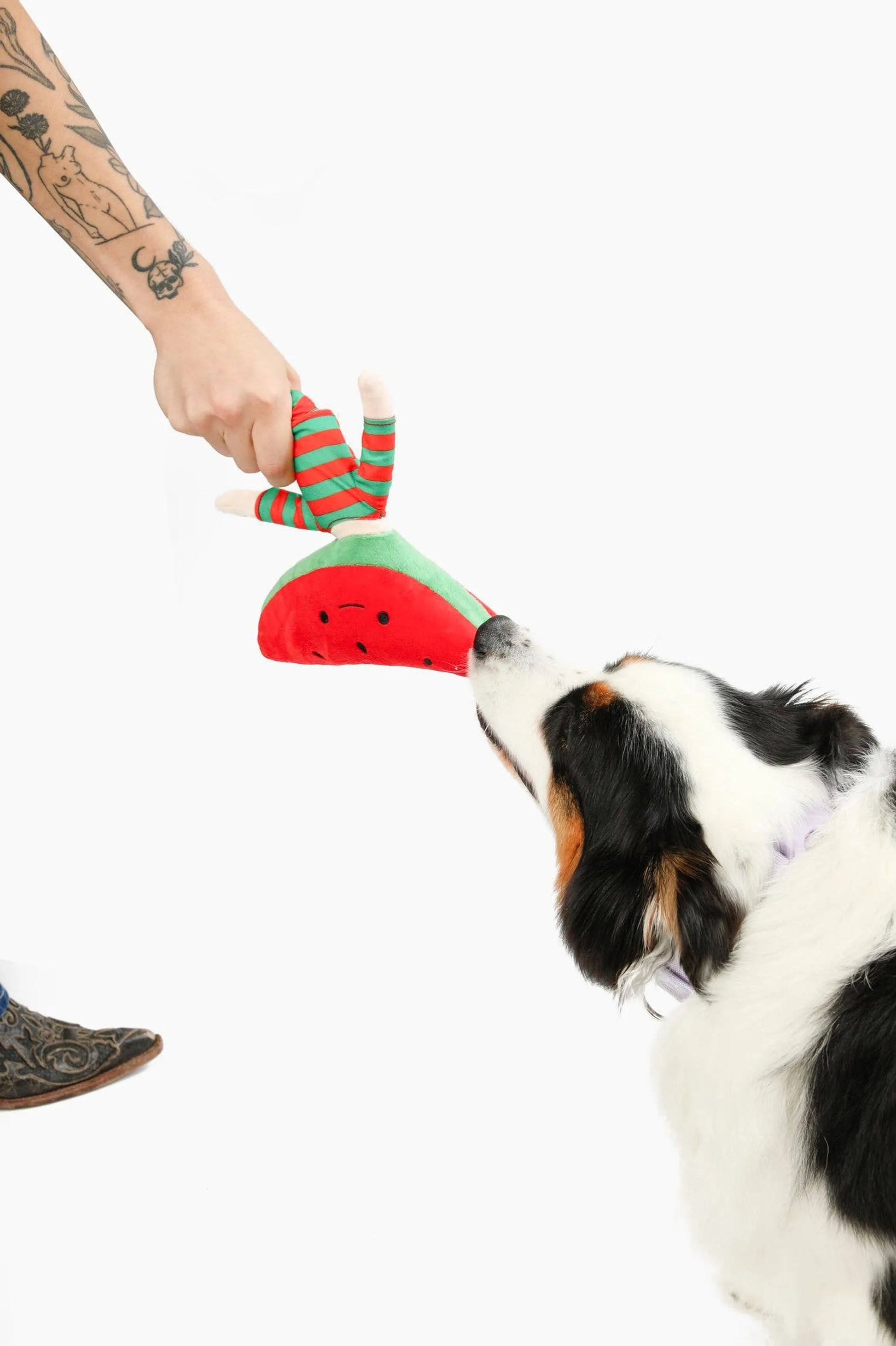 Say hello to Watermelon nosework dog toy! Pull out the inner fabric on its back pocket to hide treats on each circle. Wrap it back into the pocket for dog to enjoy. This toy is perfect for a good nosework session with you pup!