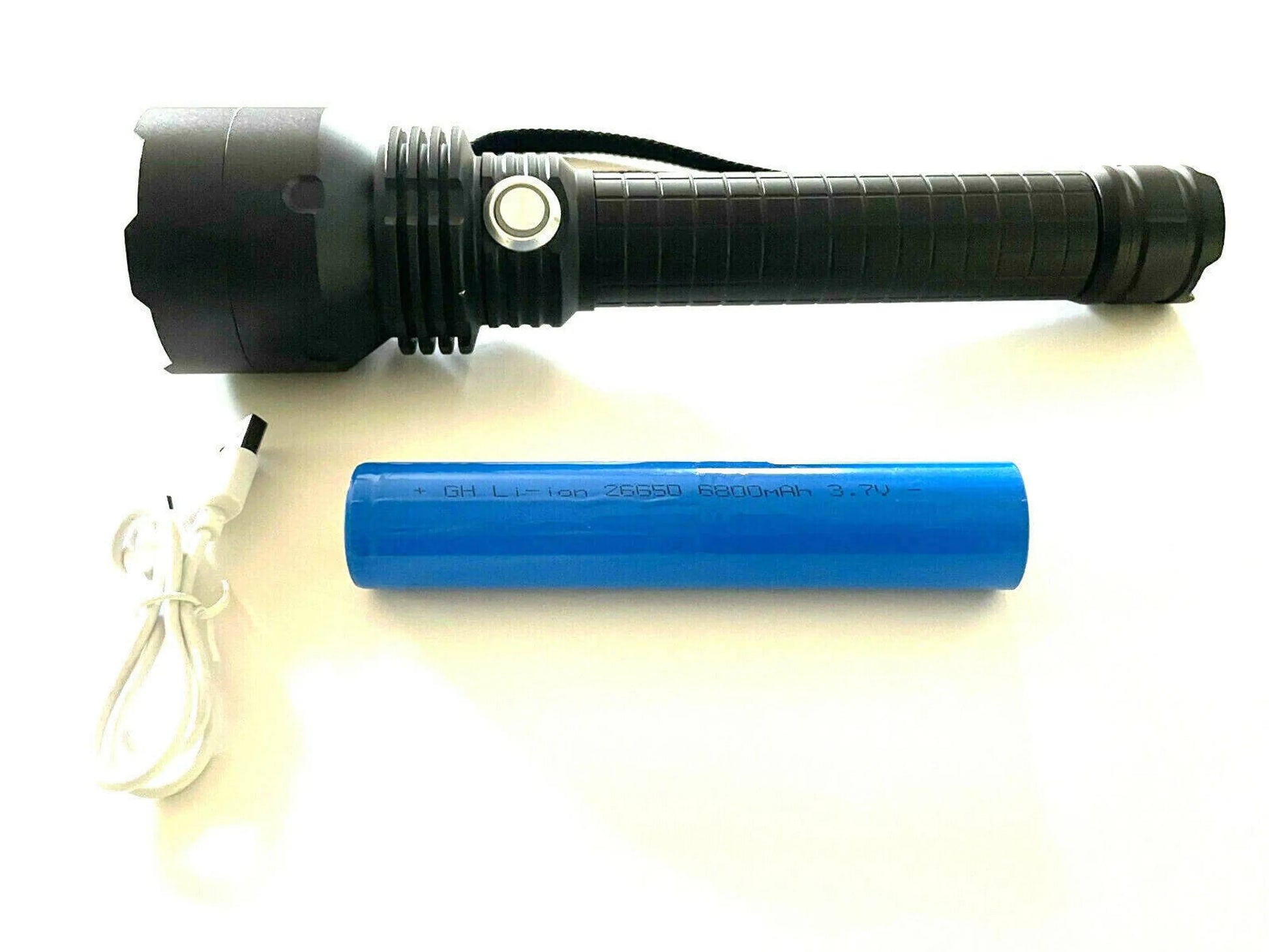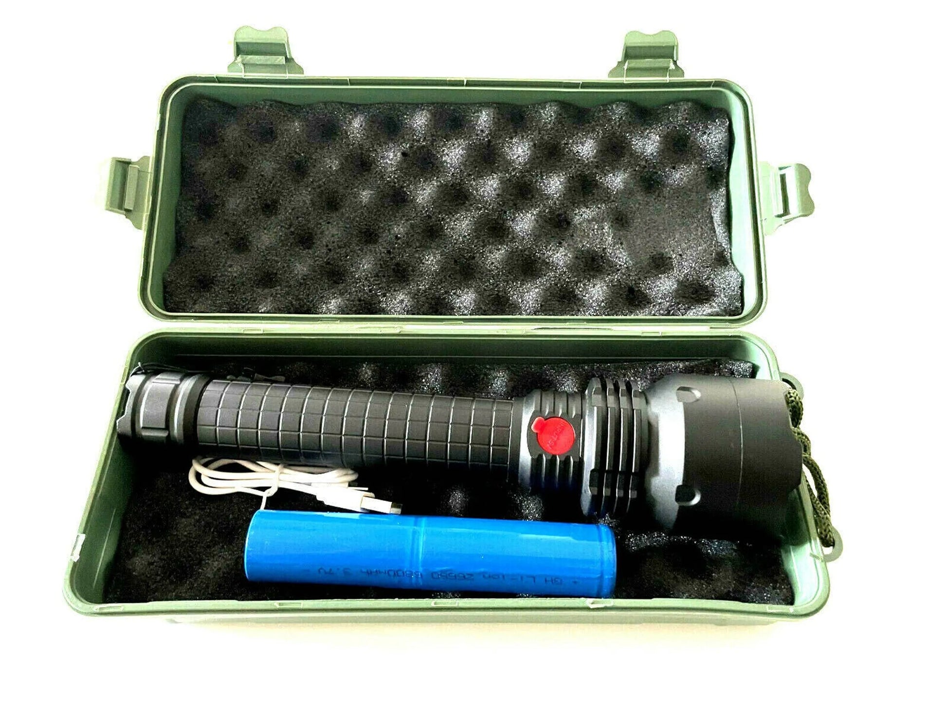 Waterproof led super bright usb rechargeable w/boxled flashlight multi function (adjustable zoom head rotation dimming)usb rechargeable & battery included (26650 6800mah 3.7V)great for travel, camping, hunting, outdoor, indoor home, garage, office, emergency and many other useswhats in the (waterproof led super bright usb rechargeable w/box)?-1X led light-1x rechargeable battery-1x usb rechargercomes in a box.