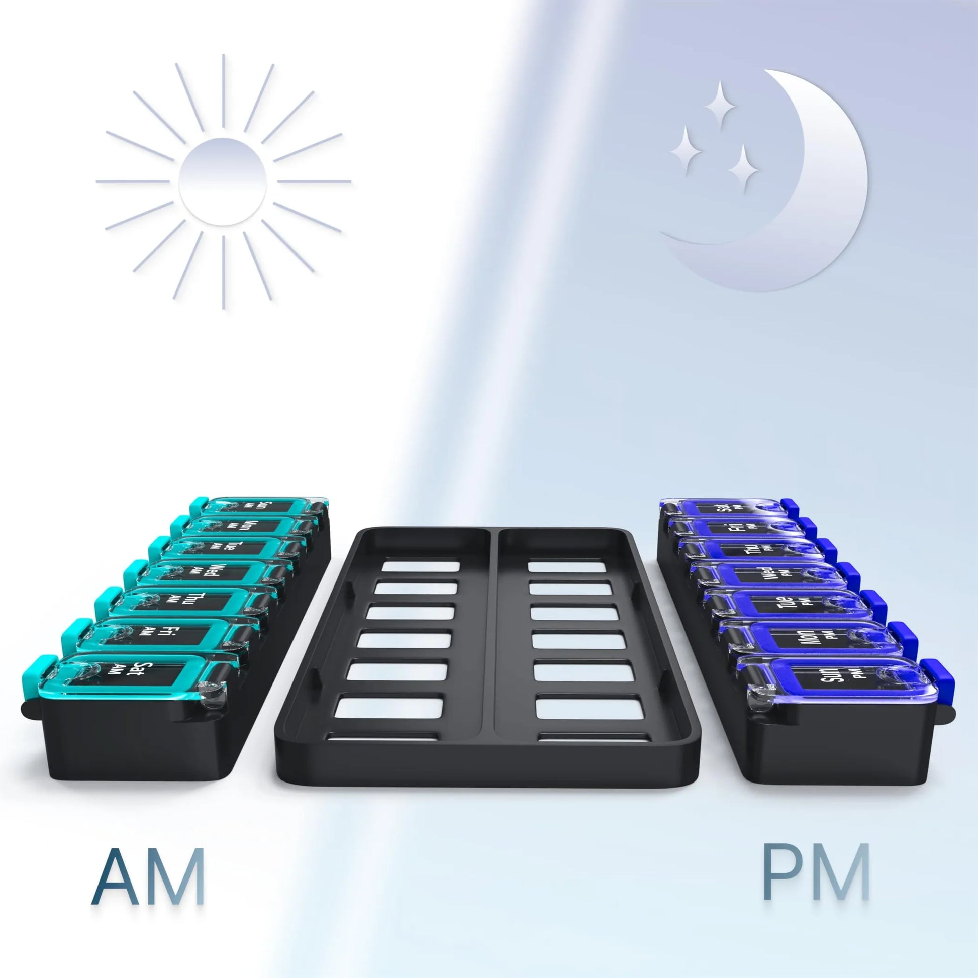 Color-Coded : One pill box 7 day features yellow lids for AM doses, while the other has blue lids for PM doses, facilitating easy pill management. Clear day labels on each lid ensure quick identification