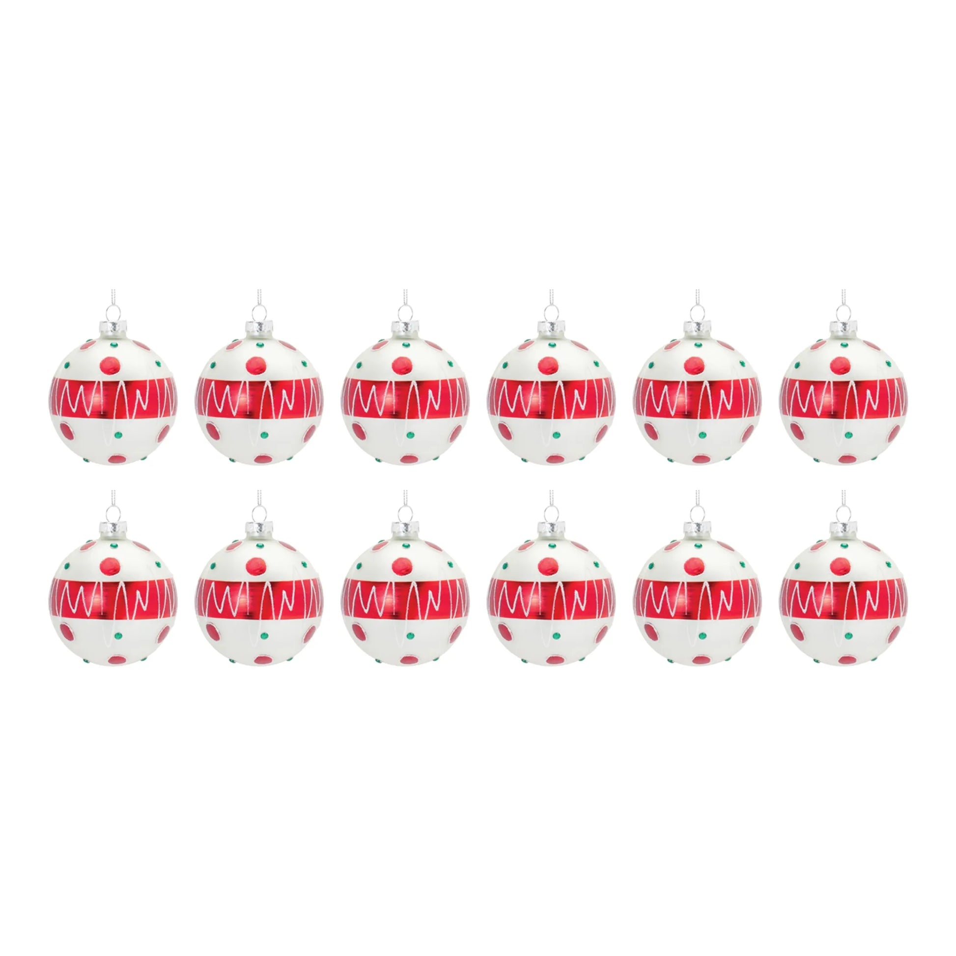 Adorn your Christmas tree and holiday decor with this stunning set of Whimsical Glass Ball Ornaments. Featuring 12 pieces, the festive red and wintry white tones paired with the glittered design is the perfect combination to create a memorable display. The quality glass composition and delicate silver string hanging accent is sure to endure for seasons to come. Whether you're adding a touch of cheer to your home or gifting to a loved one, these ornaments will definitely bring smiles.