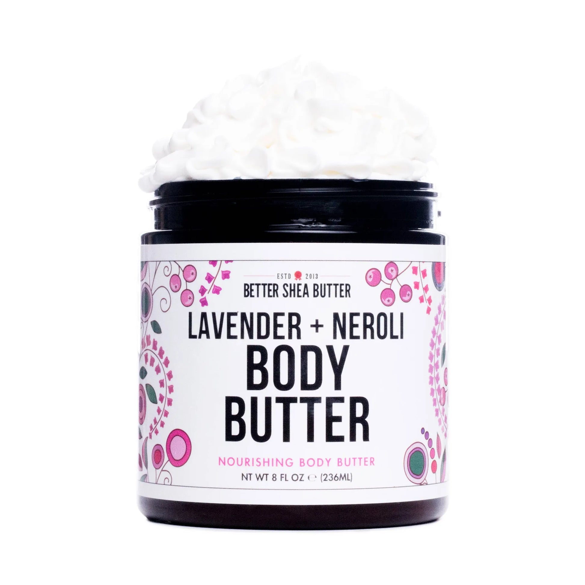 Our Lavender Neroli Body Butter is loaded with vitamins, fatty acids and antioxidants that deeply moisturize the skin. With ingredients like raw shea butter, jojoba oil and vitamin E this is sure to give your skin the moisture it craves. It is scented with essential oils only, never any artificial scents or perfumes. Each batch is whipped to perfection so you end up with a fluffy, lightweight body butter that absorbs right into your skin, leaving it feeling soft and silky. Our Lavender Neroli Body Butter is infused with a blend of lavender, neroli and citrus essential oils. The smell is both soothing and refreshing, perfect after a long days work or to start your day off just right. This lavender + neroli shea body butter is popular for the fact that it deeply moisturizes but does not leave a greasy residue on the skin. It is safe for all skin types and can be used all over the body.