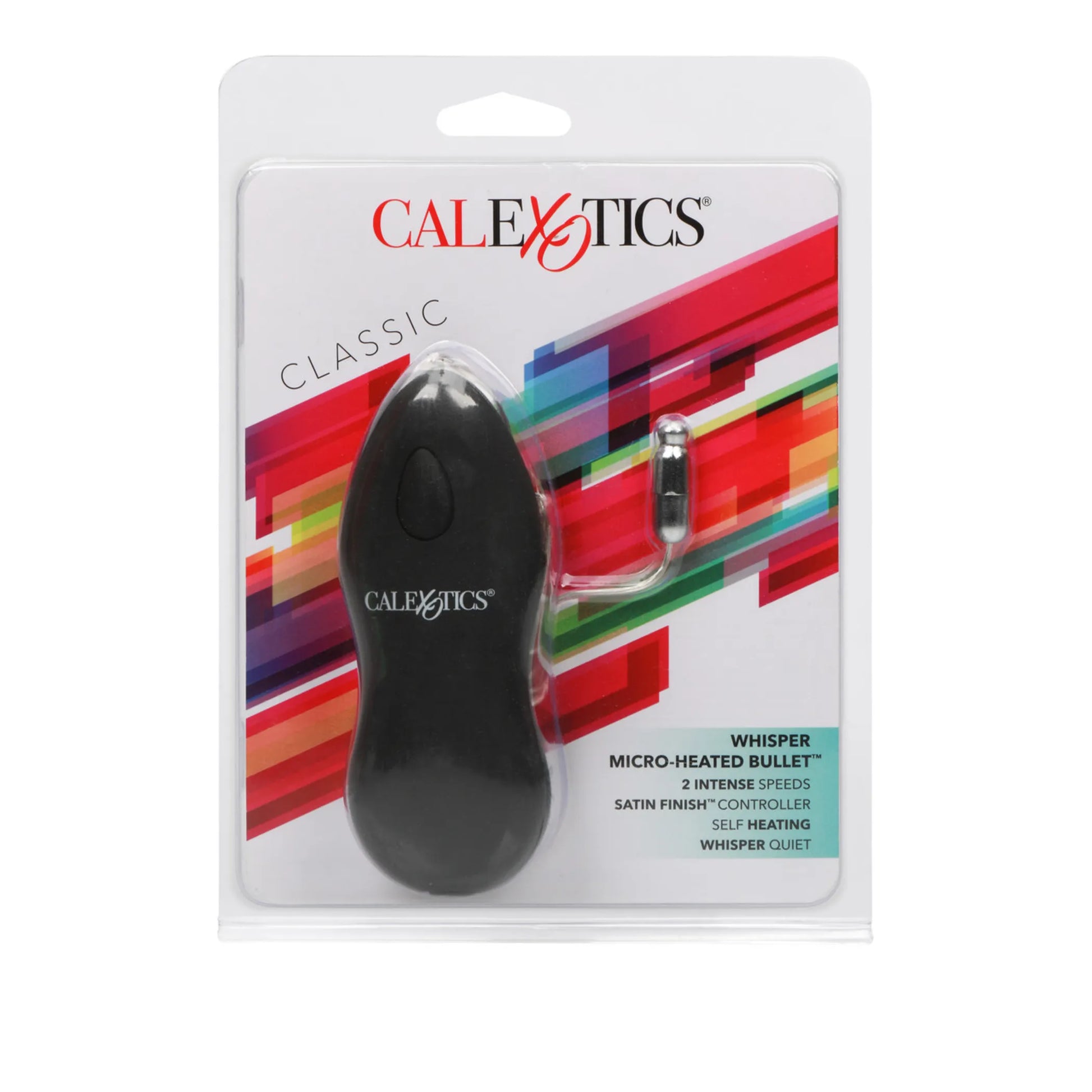 Whisper Micro Heated Black Vibrator Pleasure Toys from California Exotic Novelties. Get the 2 speed Whisper Micro Heated Bullet in black for discreet massage and fun at home or away. This handy little massager is perfect for intimate massage, stimulation or relaxation anytime and anywhere. Plus it comes with a whisper quiet motor to keep your private playtime as discreet as possible. The micro bullet is made with a smooth, high quality silver plated finish. It is safe to use on your skin and can be used anywhere on the body, and is especially fantastic for your erogenous zones and your most intimate areas. Attached by a cord to a simple control pad, you can control the vibrating pleasure function from one single push button. The micro bullet features a pinpoint tip that heats up with the powerful vibrations. The comforting, arousing warmth together with the 2-speed vibrating action will help to increase blood flow and circulation, while giving you the ultimate bodily stimulation for foreplay or private playtime. Whisper quiet, soft Rubber Cote, 2 speed micro-bullet heats up with powerful vibrations. Ergonomic battery pack with EZ push button control. Vibrating sex toy requires 2 AA batteries not included. Do not leave batteries in the vibrator between uses. A water based lubricant is recommended. Made using phthalate free, non-toxic materials: ABS plastic with silver plating bullet. Micro bullet vibrator measures 1 inch long by .2 inch wide. 1 year warranty. Whisper Micro Heated Bullet is a registered trademark for California Exotic Novelties. Categories: Vibrators, Pleasure Toys, Bullets and Eggs Vibrators, Sex Toys for Women, Vibrating Bullets and Eggs. 2023.
