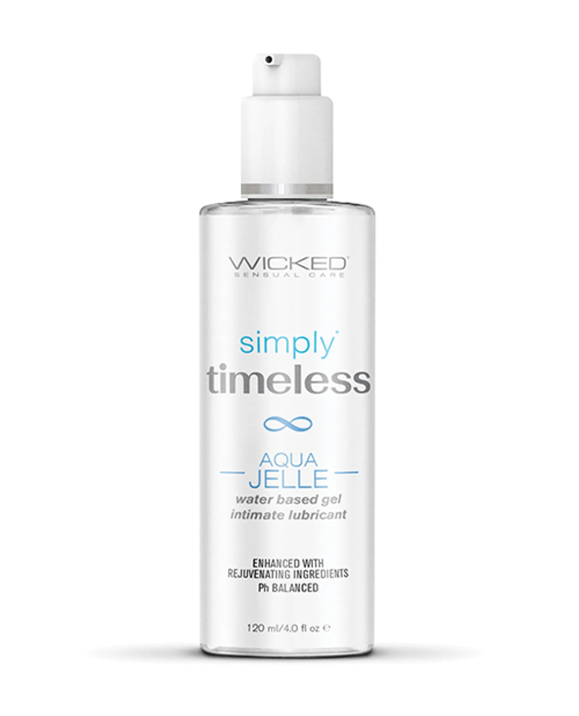 Wicked Timeless Aqua Jelle Lubricant 4 fluid ounces from Wicked Aqua. Simply Timeless lube is uniquely formulated to address the specific needs of individuals during the perimenopausal and menopausal stages and beyond. Each formula contains ingredients that can help alleviate dryness and promote a more comfortable and satisfying intimate experience. Each lube contains supportive ingredients like aloe, olive leaf extract, squalane, and Vitamin E. These supportive ingredients are what makes it different from the rest of the Simply line. Like all products under the Simply label, Timeless formulas are free from glycerin, parabens, and propylene glycol. Can also be used as a daily vaginal moisturizer. Directions: begin with a small amount of Simply Timeless lube to the desired area as needed. Reapply as necessary to maintain comfort and lubrication during intimate moments. Ingredients: Water, Sodium Hyaluronate, Aloe Barbadensis Leaf Juice, Squalane, Olea Europaea Olive Leaf Extract, Tocopherol Vitamin E, Stevia Rebaudiana Leaf/Stem Extract, Hydroxyethylcellulose, Cellulose gum, Sodium Chloride, Citric Acid, Sodium Benzoate, Potassium Sorbate. Simply Collection with clean ingredients: Wicked Sensual Care?EUR(TM)s Simply line is a collection of water based and hybrid lubricants that are also glycerin and propylene glycol free. When you want a clean lube do it simply. Simply Timeless lube was specifically formulated to address the unique needs of those experiencing perimenopause and menopause, providing enhanced comfort and moisture to improve intimate experiences during all phases of life. Your journey through menopause is uniquely beautiful, a testament to resilience and evolving desires, but you are not alone in that journey. Categories: Lubricants, Water Based, Health and Beauty Aids. 2023.