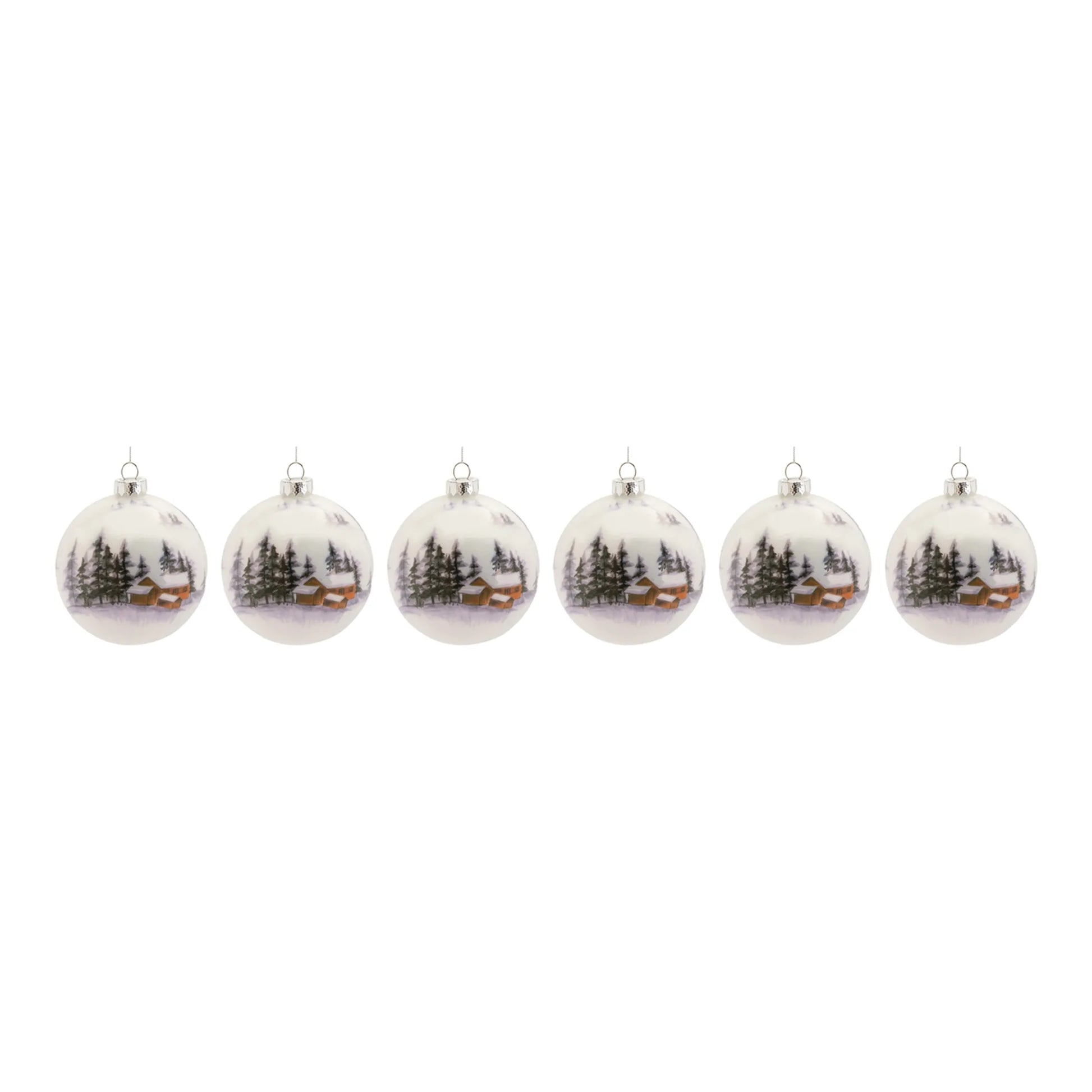 Add a rustic touch to your Christmas Tree with this beautiful set of Woodland Cabin Ball Ornaments. Featuring 6 pieces, this set's earthy green and brown tones, painted winter cabin scene design, and rustic pine tree accents are the perfect combination to create a memorable display. The quality glass composition with silver string hanger is sure to endure for seasons to come. Whether you're adding a touch of cheer to your home or gifting to a loved one, these ornaments will definitely bring smiles to your home.