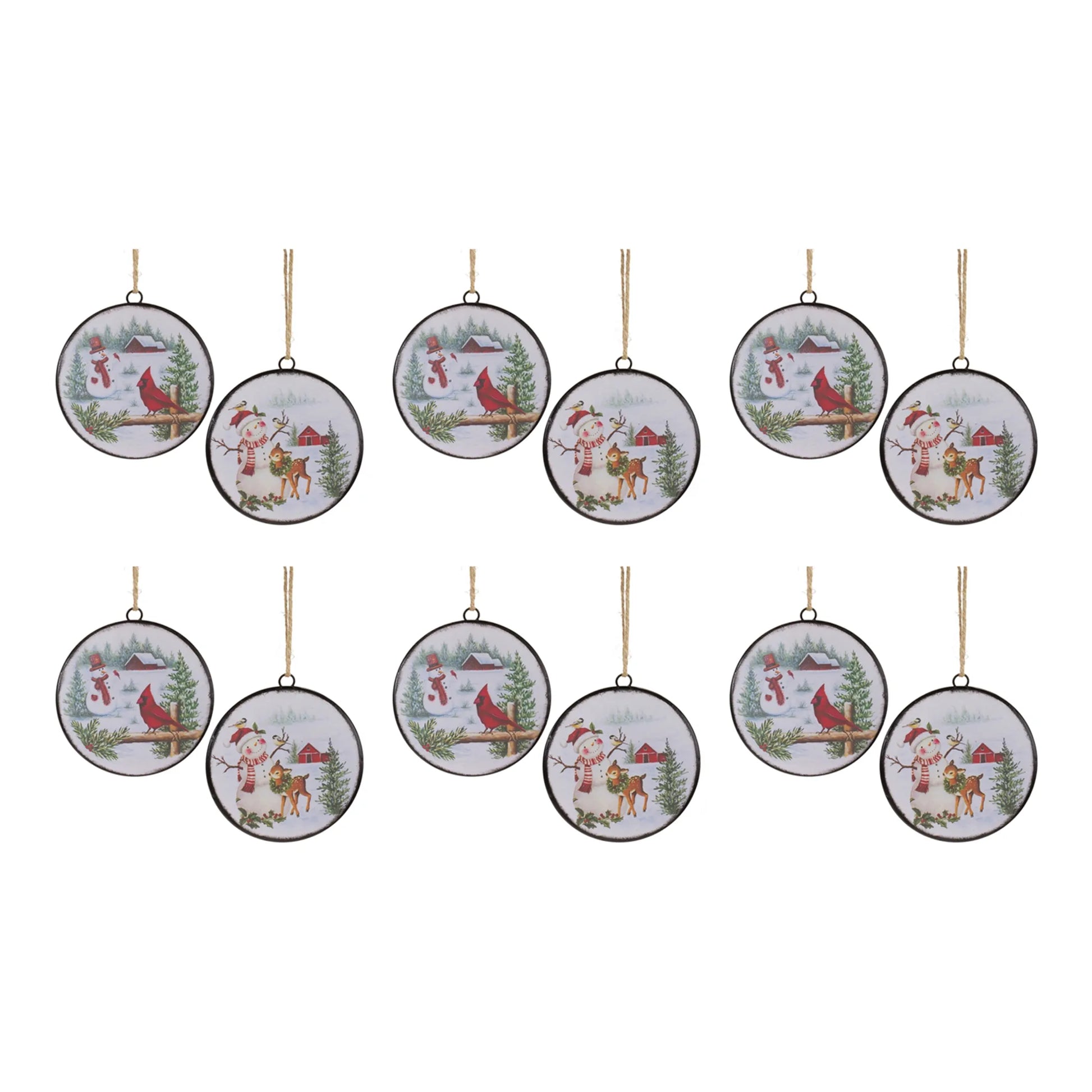 Add a rustic touch to your Christmas Tree with this beautiful set of Woodland Snowman Disc Ornaments. Featuring 12 pieces, this set's festive red and green tones, painted winter woodland design, and snowman, cardinal bird, and deer accents are the perfect combination to create a memorable display. The quality glass composition with string hanger is sure to endure for seasons to come. Whether you're adding a touch of cheer to your home or gifting to a loved one, these ornaments will definitely bring smiles to your home.