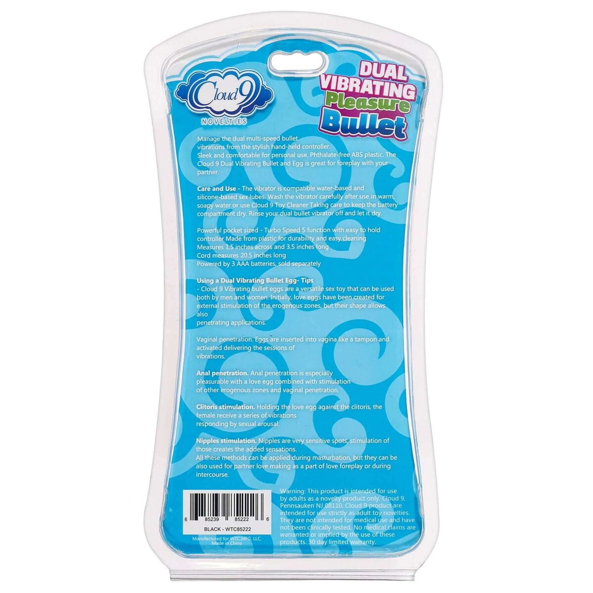 The Cloud 9 Novelties Bullet features 5 vibrating functions with attached wired remote and clitoral stimulator. This dual vibrating Bullet is great for foreplay with your partner! Manage the multi-speed bullet vibrations from the stylish hand held controller. Velvety in texture and comfortable for personal use, this product is made of body safe, phthalate free ABS plastic with polyurethane PU coating. Care and use the Cloud 9 Vibrating Pleasure Bullet is compatible with both water based and silicone based lubes. Wash the vibrator after each use in warm, soapy water or use Cloud 9 Toy Cleaner. Splash-proof only. Features: 5 vibrating functions. Easy to hold soft PU coated controller. Pleasure bullets great for couples or solo use. Attached power control wire length 24 inches. Light Emitting Diode LED indicator light. Specifications: 3 speed and 12 functions with easy to hold controller. Ergonomically designed remote control. Bullet attachment measures 2.16 inches across and 1.0 inch long. Cord measures 24 inches long. Vibrating egg requires 3 AAA batteries, not included. Sold separately. Categories: Vibrators, Sex Toys for Women, Vibrating Bullets and Eggs, Dual Bullets and Eggs. Manufactured for Cloud 9 Novelties. Made in China. Weight 3.7 ounces. Restricted, Amazon, Restricted. 2022.