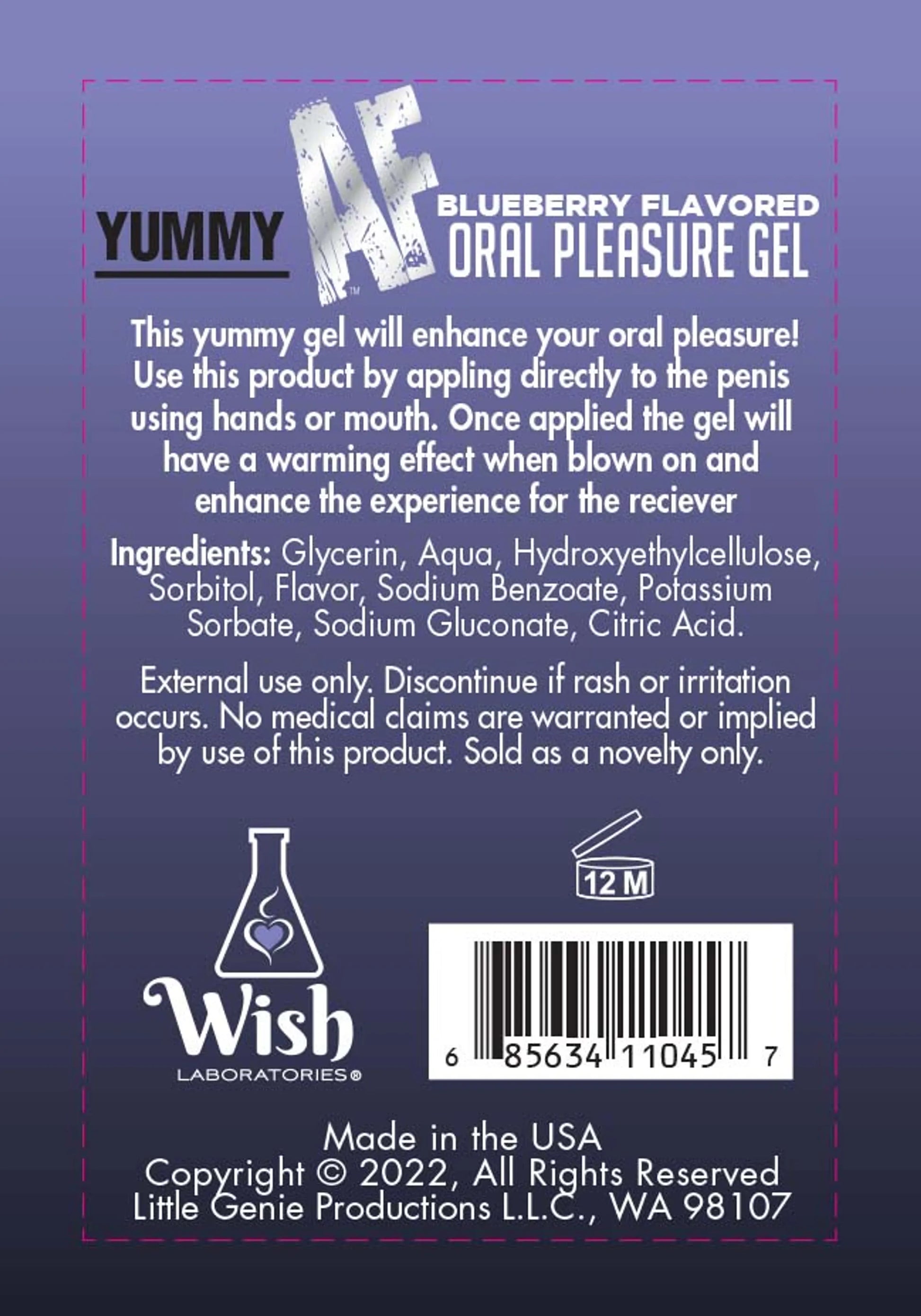 Yummy AF Oral Pleasure Gel Blueberry 2.2 fluid ounces from Little Genie. Juicy AF will make your intimate encounters more luscious. This water based lubricant effortlessly enhances the pleasures of intimacy. Whether you like to play alone or with friends, AF Lubricants provide that wet and juicy feel for sheer satisfaction. Relish in the pure ecstasy of sexual play, reduce discomfort with this long lasting lube that washes off clean with water. Make sex more delicious with Yummy AF lubricant. How to use: apply a small amount of lubricant onto your fingers and apply prior to sexual activity. Reapply as needed or desired. Categories: Lubricants, Flavored Lubricants, Oral Products, Health and Beauty Aids. 2023.