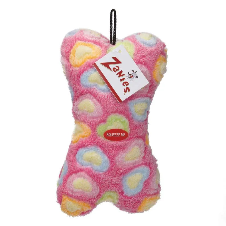 Poly-filled plush bone toys with sweetheart pastel pattern and squeaker will be irresistible. 7.5" bones are perfect for snuggling and play. Great for restocking retail displays and promoting impulse buys.